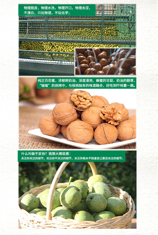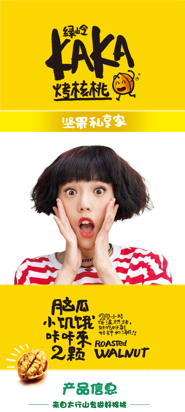 產(chǎn)品簡介:KAKA烤核桃,采用綠嶺有機(jī)核桃為原料,使用宮廷秘制配方和轉(zhuǎn)爐工藝,經(jīng)過24小時低溫烘烤,讓原本就美味的核桃,顆顆入味;讓人吃起來不想停,吃過后還想吃,充分享受皇家貴族之尊味。